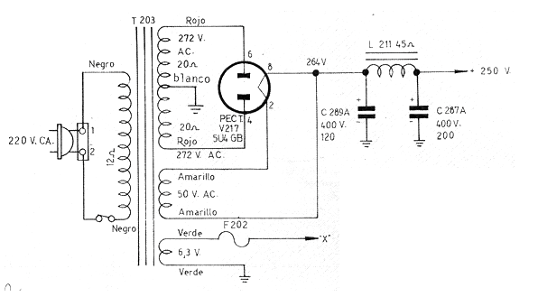 Esta es una fuente de alimentación convencional para equipos valvulados. La corriente de secundario de voltaje puede permanecer entre 80 y 300 mA dependiendo de la aplicación. Este diagrama fue obtenido de una documentación antigua de la década de los 60.