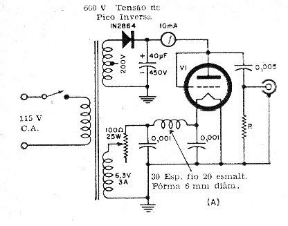 Este circuito, sugerido por una antigua publicación técnica, genera ruidos blancos a partir de una válvula triodo que puede ser una 6C4, la mitad de una 12AX7 o 12AU7.