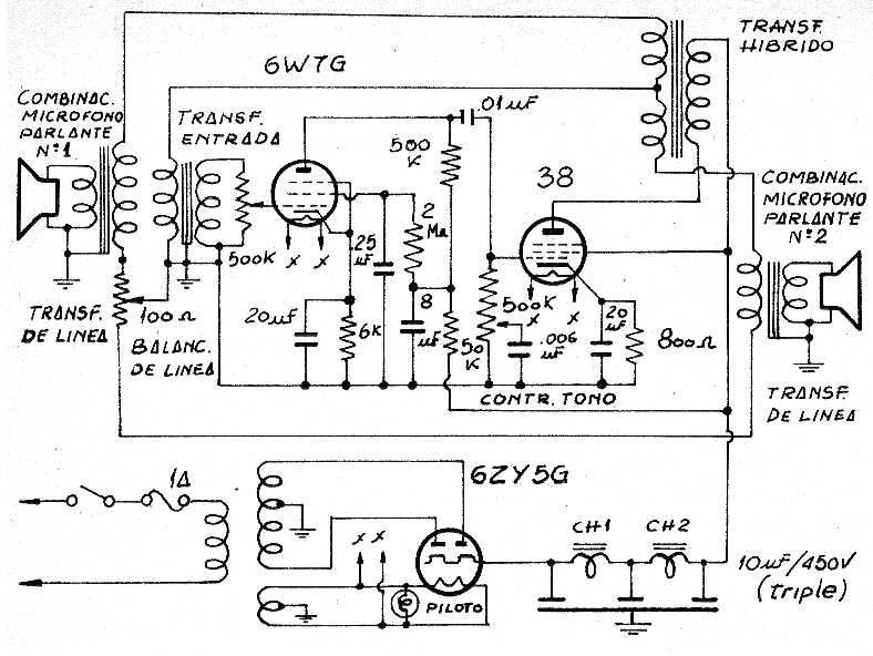 El interesante circuito que presentamos fue obtenido de una publicación de 1972, consistente en un intercomunicador con hilos que utiliza tres válvulas. Los componentes críticos, además de las válvulas son el transformador, ES, principalmente el transformador híbrido que funciona como un sistema de inversión de fases para las señales para que no ocurre microfonía.