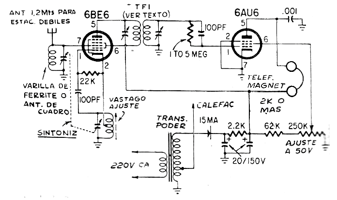 En el caso de los circuitos valvulados depende del transformador y de las propias válvulas. En este circuito la bobina de antena consiste en 80 espiras de hilo 28 AWG en un bastón de ferrita y la escucha hecha en auricular de 2 k o aún piezoeléctrico conectado en paralelo con un resistor de 2 k.