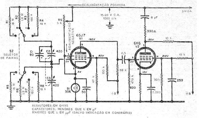Este circuito fue obtenido en una publicación de enero de 1961. Se trata del sector de oscilación de un generador de audio comercial (Eico). El circuito consiste en un puente de Wien con 4 bandas de frecuencias de 10 Hz a 100 kHz. La alimentación viene de fuente externa cuya tensión debe estar entre 150 y 250 V.