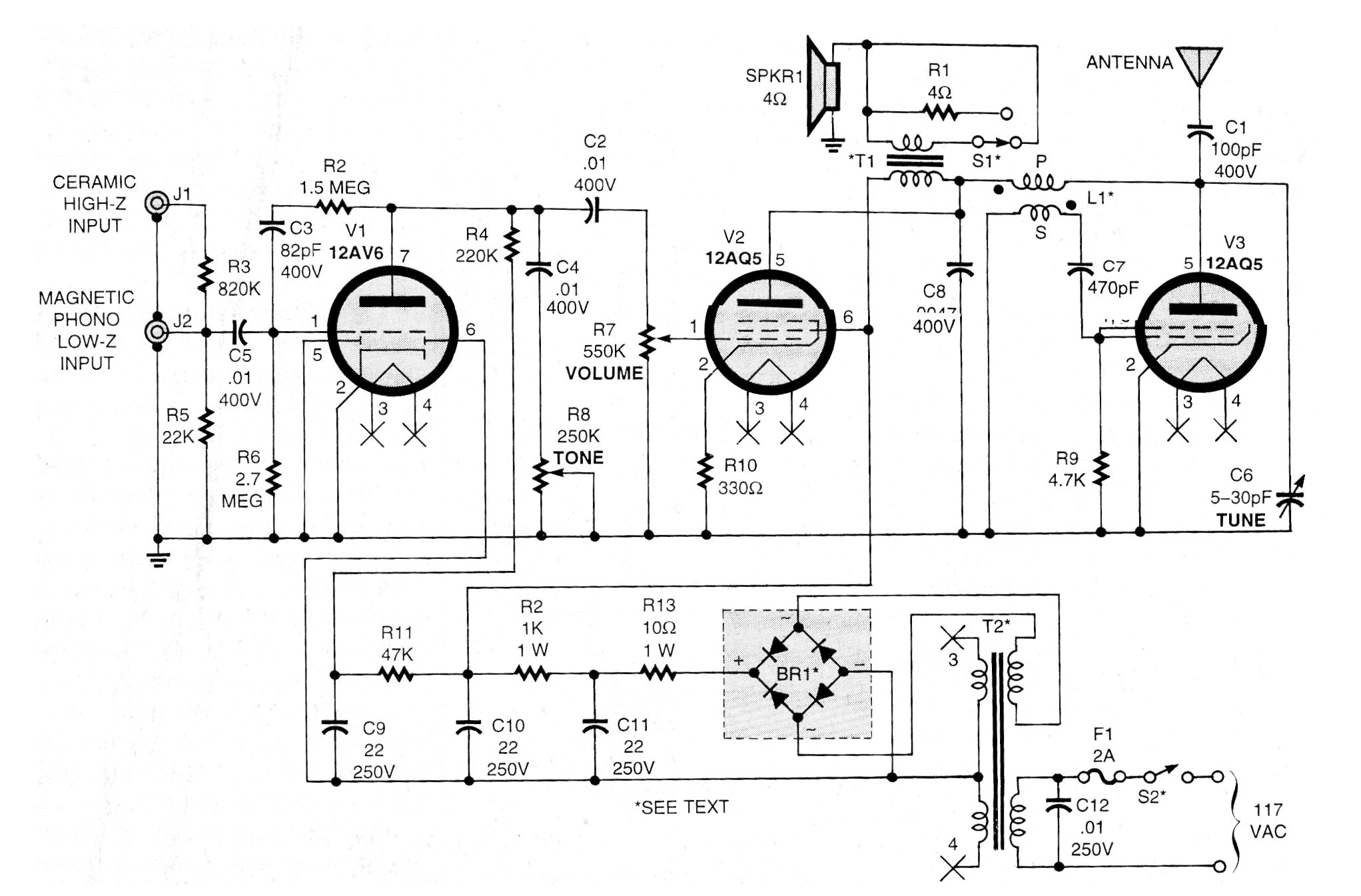 Este circuito utiliza tres válvulas para transmitir a corto distancia señales de un tocadiscos o micrófono, como una pequeña estación doméstica de radio. La antena puede tener de 1 a 5 metros y el transformador L1 es un transformador de FI de una radio antigua, desde donde se han retirado los condensadores.