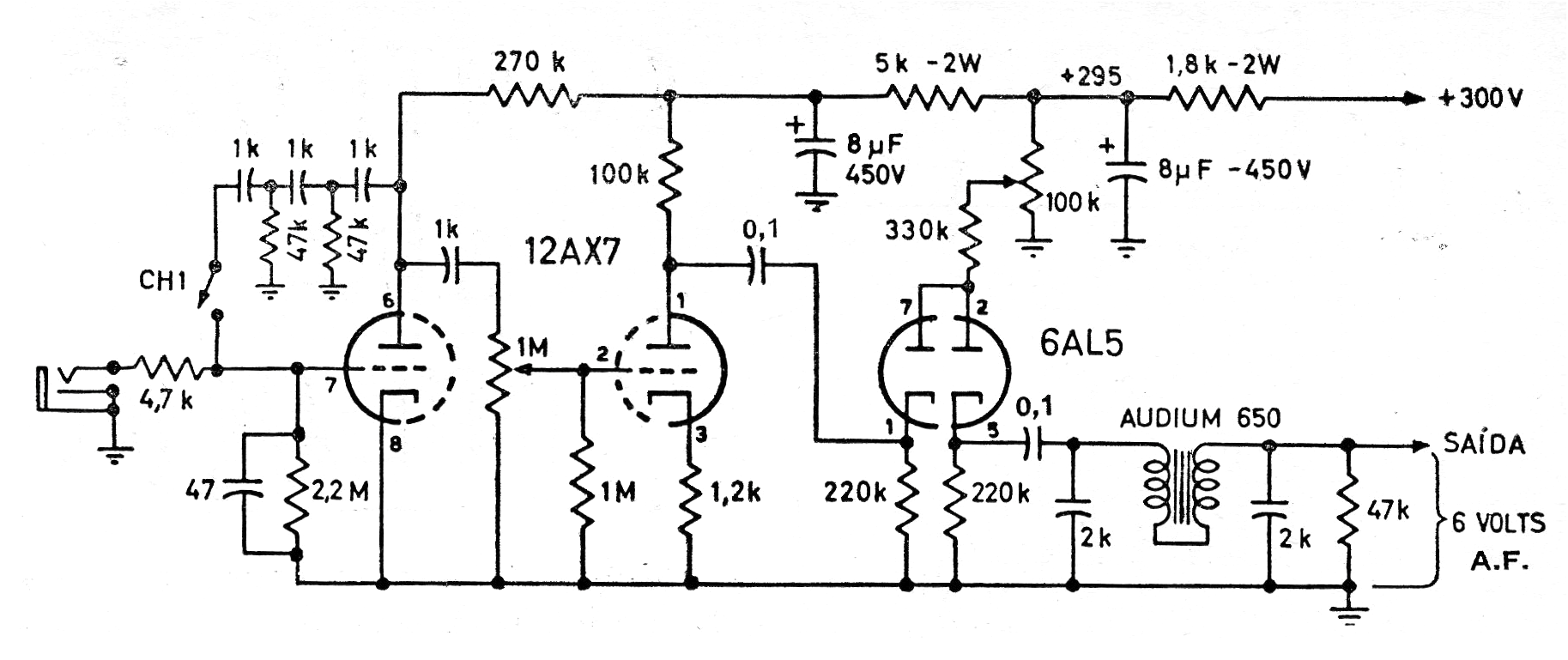 Este circuito, obtenido de documentación de 1965, aumenta las frecuencias de la banda de voz, sirviendo para obtener mejor inteligibilidad en transmisores, sistemas de comunicación y sonorización ambiental. Los componentes críticos, además de las válvulas son los transformadores, en particular el Audium que es un transformador de 1: 1 con bobinas de 650 ohms. La fuente apropiada se debe utilizar para alimentar este circuito.