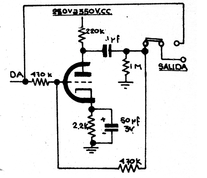 Este circuito consiste en un inversor de fase para amplificadores de audio con salida en push pull sin el transformador controlador. El circuito fue obtenido en un antiguo manual argentino y hace uso de la mitad de un doble triodo. La alimentación viene del propio circuito amplificador con el que se utilizará o se incorporará. El consumo es bajo.