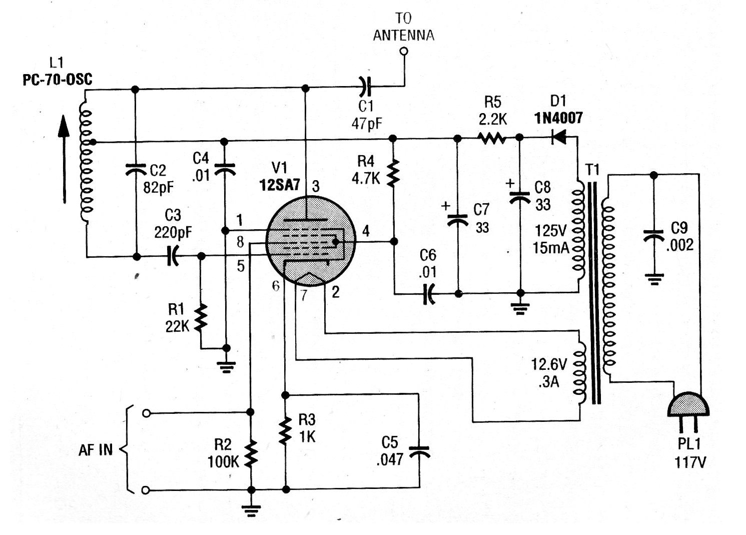 Este transmisor valvular fue encontrado en una publicación reciente como una posibilidad de realizar un montaje valvular de los años 30. El circuito utiliza una12AS7 como osciladora y la bobina está formada por 30 + 70 espiras de hilo 28 en un bastón de ferrita. La antena es un cable con un máximo de 5 metros de longitud. El componente crítico además de la válvula es el transformador. El núcleo de la bobina debe ser móvil para hacer el ajuste de la frecuencia. Se puede tener un núcleo fijo, sustituyéndose C2 por un capacitor variable. El alcance debe llegar a unos 100 metros.