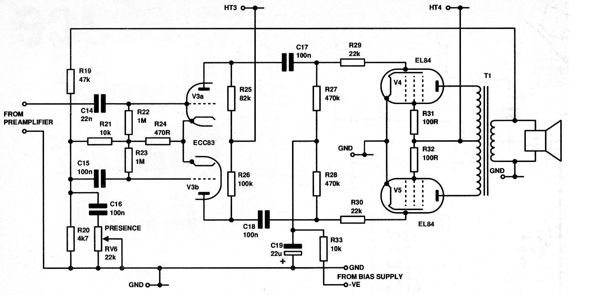 Este circuito es de una revista de 1994, pero bastante actual para los que aún disfrutan válvulas, aunque el componente crítico, además de las válvulas es el transformador de salida. El preamplificador está en otro artículo y la fuente de alimentación también. Una buena idea de diseño para los que creen que el sonido de las válvulas sigue siendo mejor que el suministrado por otras tecnologías.