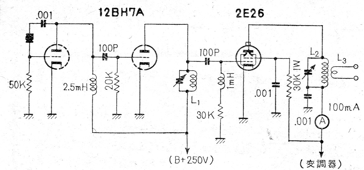Este circuito fue encontrado en una publicación japonesa de los años 60. El circuito está destinado a la operación en onda continua (CW) en el rango de 21 MHz (15 metros) para radioaficionados. El circuito no incluye la fuente de alimentación y las bobinas deben ser de acuerdo con el rango de frecuencias generadas.