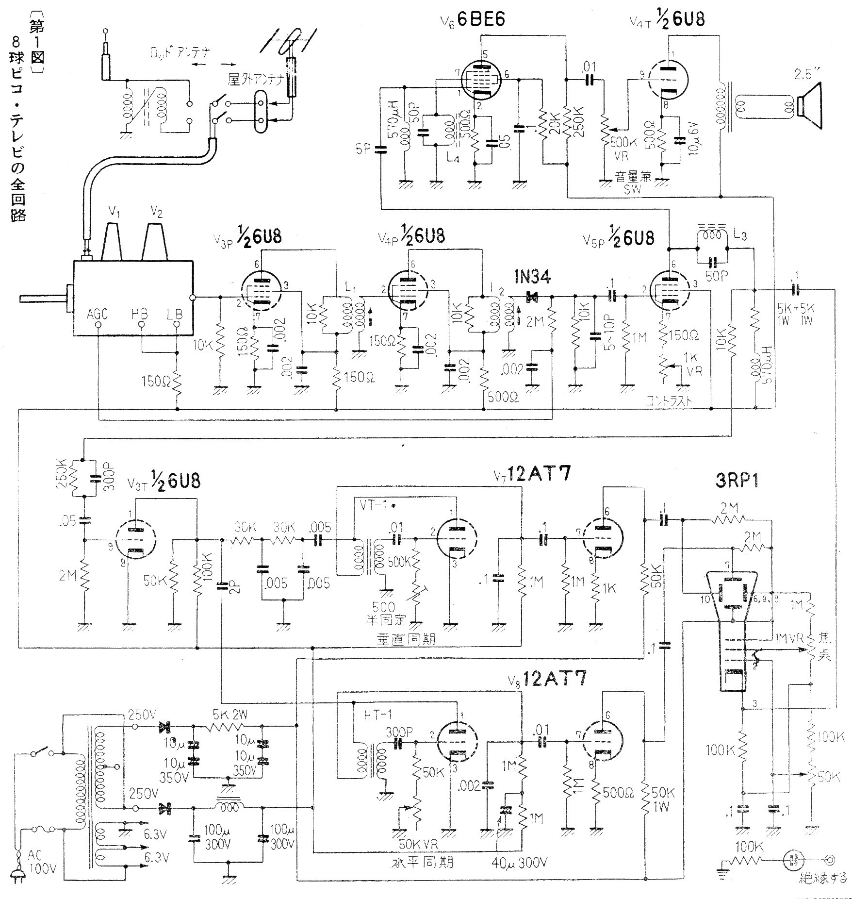 Este circuito de los años 60 es muy interesante. Consiste en un osciloscopio que también es un receptor de TV analógica. El circuito utiliza un selector de TV estándar comercial de la época. Encontramos en una documentación de los años 60.