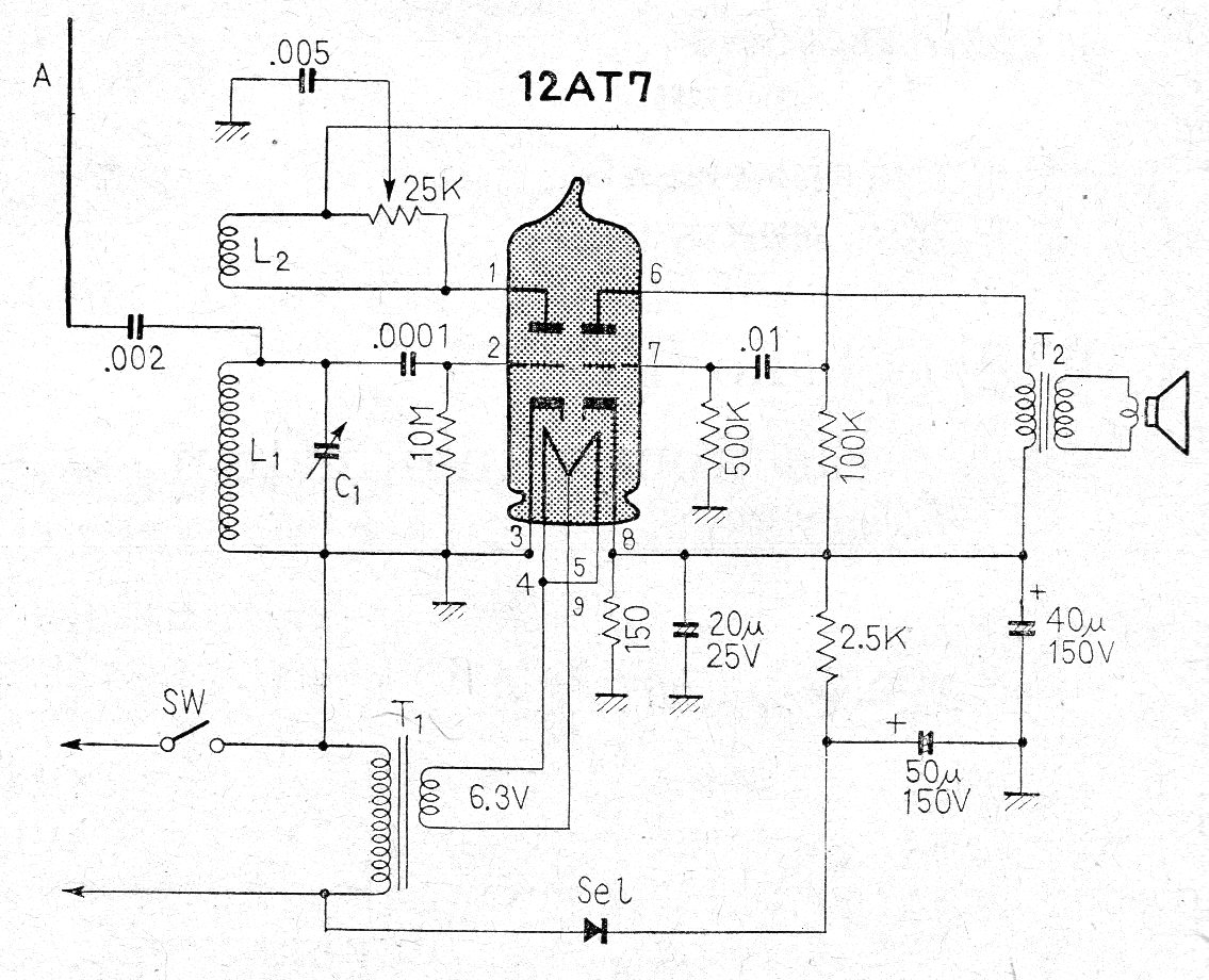 Este simple receptor de AM utiliza sólo una válvula doble triodo destinada a la recepción de las señales de la banda de ondas medias. El circuito incluye una fuente simple y los componentes no son críticos. L1 tiene 100 espiras de hilo 28 en un tubo de 2,5 cm y L2 10 espiras en el mismo tubo.
