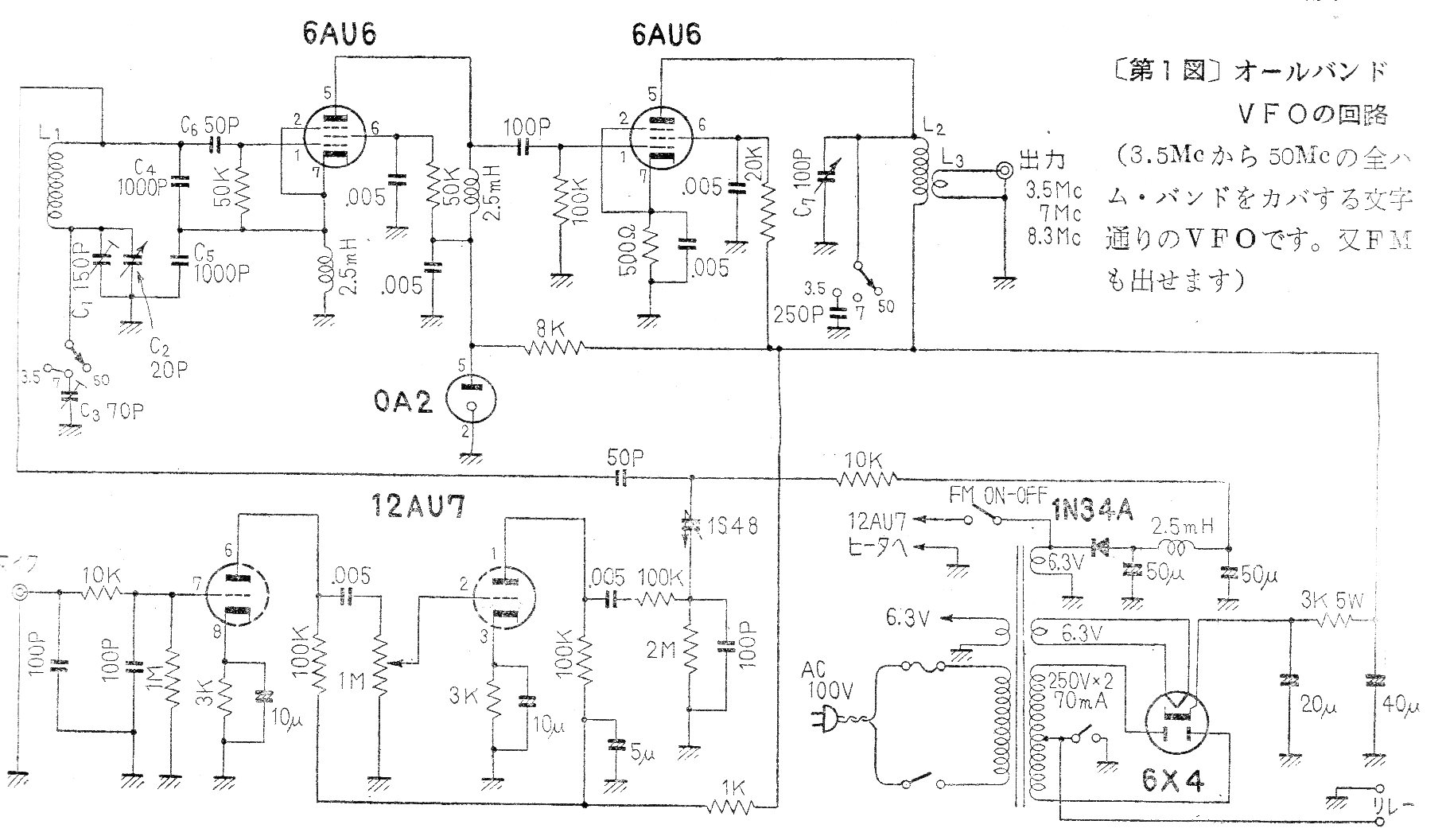Este oscilador de frecuencia variable (VFO en inglés) utiliza válvulas llegando a generar señales hasta el rango de FM conforme a las bobinas. El circuito es de una antigua publicación japonesa. Las bobinas son de acuerdo con el rango de frecuencias que se desea generar.