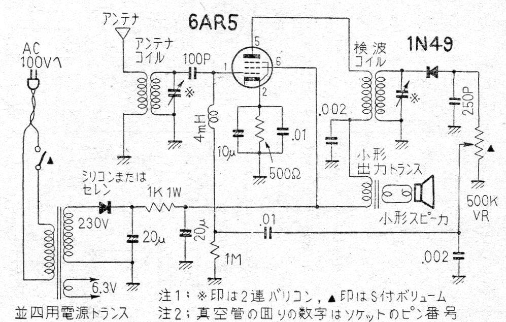 Esta radio AM de 1 válvula sólo fue encontrada en una edición japonesa de la revista Radio TV & Electronics de los años 60. El circuito incluye la fuente de alimentación y las bobinas no son críticas.