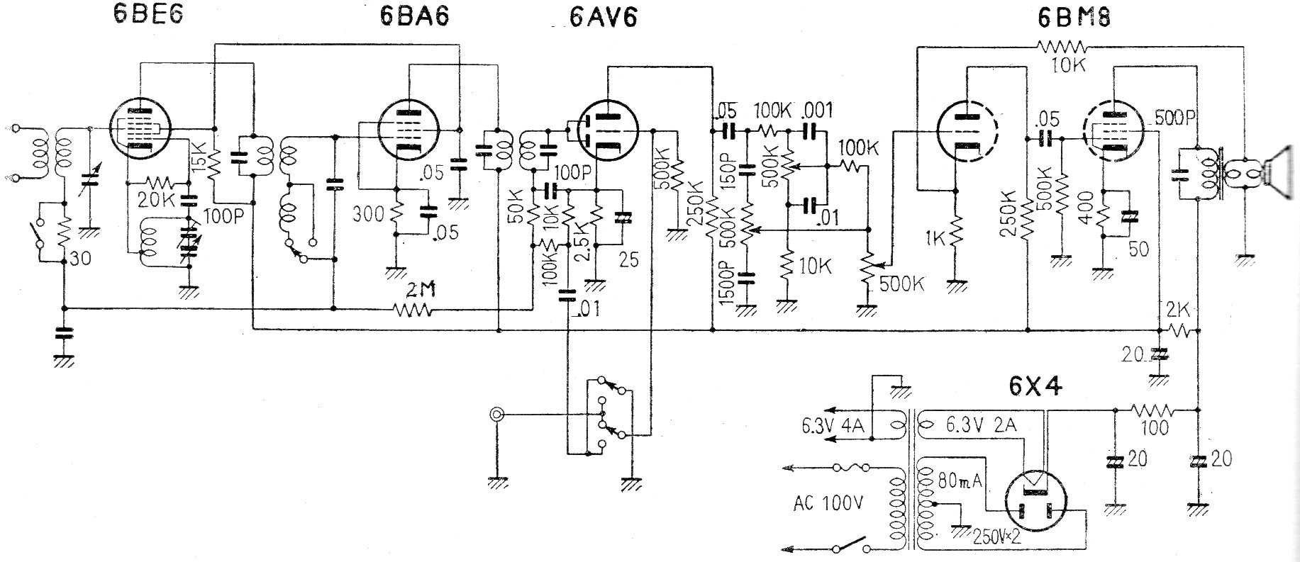 Este circuito de radio comercial para la banda de AM fue encontrado en una documentación de los años 60. El circuito es superheterodino convencional y los componentes críticos son las válvulas y los transformadores.