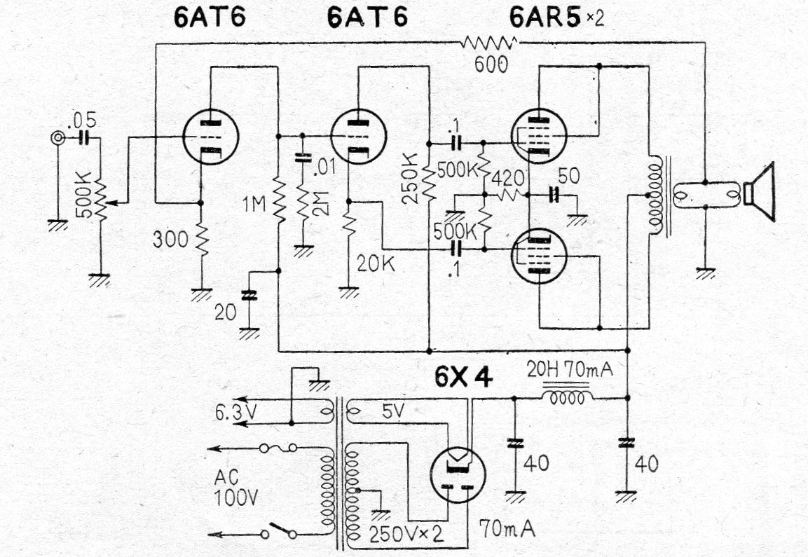 Este amplificador valvulado es de una Radio TV & Electronics japonesa de los años 60. El circuito proporciona algunos vatios de potencia con buena calidad de sonido. Los componentes críticos son las válvulas y los transformadores. Observe que en la época la red de energía era de 100 V en Japón.