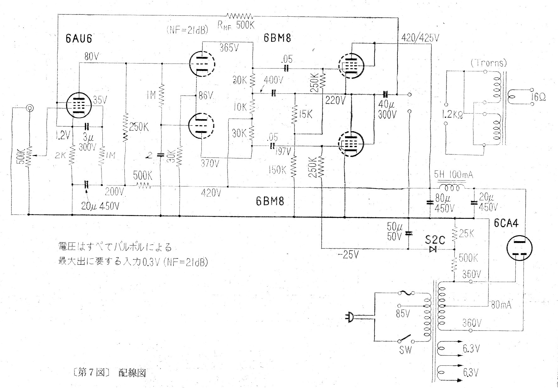 Este excelente amplificador de 4 W fue encontrado en una publicación japonesa de 1964. El circuito incluye la fuente de alimentación y tiene salida en push-pull. Los componentes críticos son los transformadores y las válvulas.