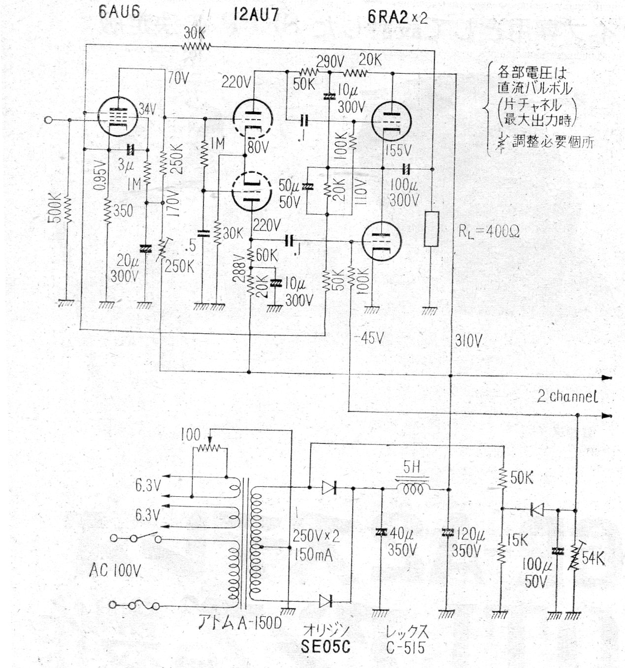 Este amplificador de potencia con una impedancia de salida de 40 ohms fue encontrado en una documentación japonesa de 1964. El circuito tiene una potencia de 7,8 W, pero las válvulas equivalentes de salida se pueden utilizar con cambios en la potencia obtenida en la salida.