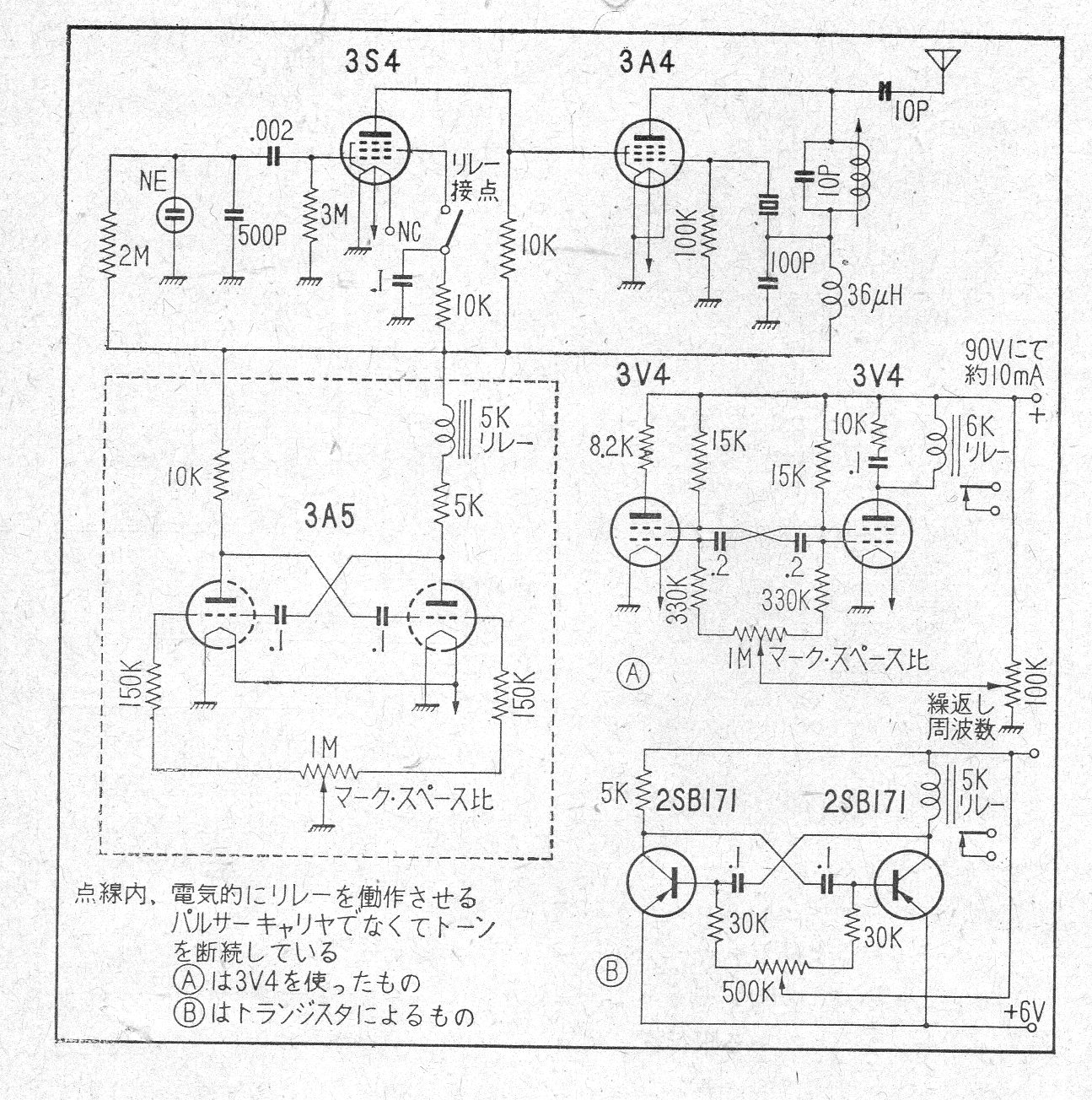 Este transmisor valvular para control remoto fue encontrado en una documentación japonesa de 1964. El circuito debe ser alimentado por batería dado el consumo y la frecuencia de operación es en el rango de 27 MHz.