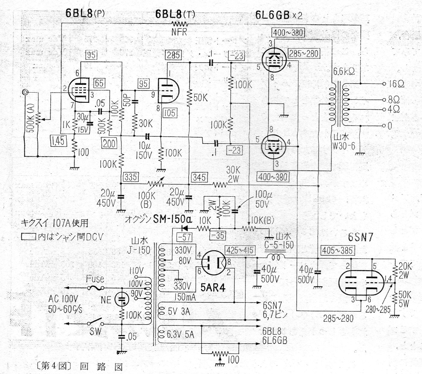Este circuito convencional con dos 6L6 en push-pull fue encontrado en una publicación japonesa de 1964. La potencia es 30 W y la fuente se incluye. La alimentación, en realidad se puede hacer con tensiones de 250 V a 330 V.