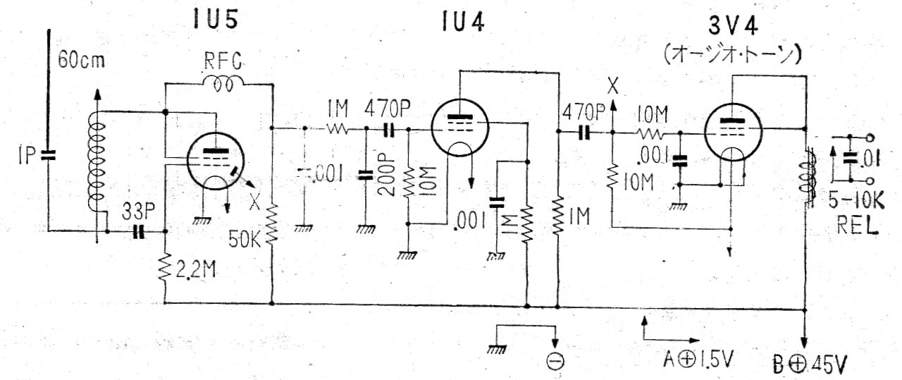 Encontramos este circuito en una publicación japonesa de 1962. Utiliza válvulas de filamento de 2,5 V alimentadas por pilas y alta tensión proveniente de una batería de 45 V, común en la época. Las válvulas ya no se fabrican.