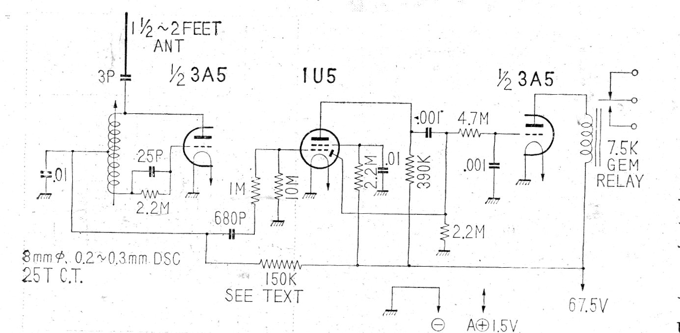 Este receptor utiliza una batería de 6,75 V para la alta tensión y 1,5 V para los filamentos en configuración común en la época. El circuito es de una publicación japonesa de 1962 y opera en 27 MHz.