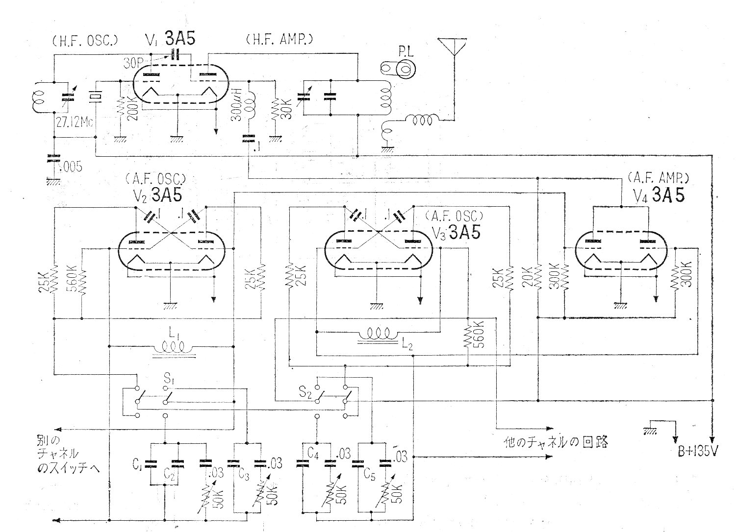 Este circuito fue encontrado en una publicación especializada japonesa de 1962. Las válvulas en este tipo de circuito eran comunes en la época lo que exigía el uso de grandes baterías. El circuito se modula en tono y los ajustes se realizan en los trimpots. El circuito opera en el rango de 27 MHz. El receptor se puede encontrar en diversos artículos de esta sección.