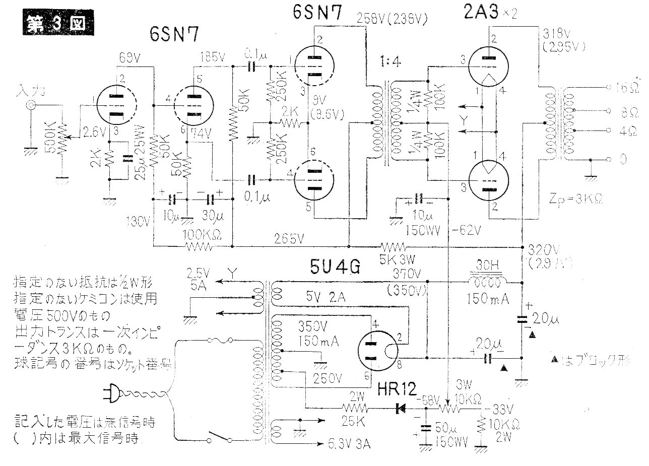 Este amplificador, que utiliza válvulas poco conocidas, como la 2A3 tiene una potencia de salida de 15 W con excelente calidad de sonido. Encontramos en una publicación japonesa de 1962. Los transformadores para este circuito son los componentes difíciles de obtener siendo necesario mandar enrollarlos.