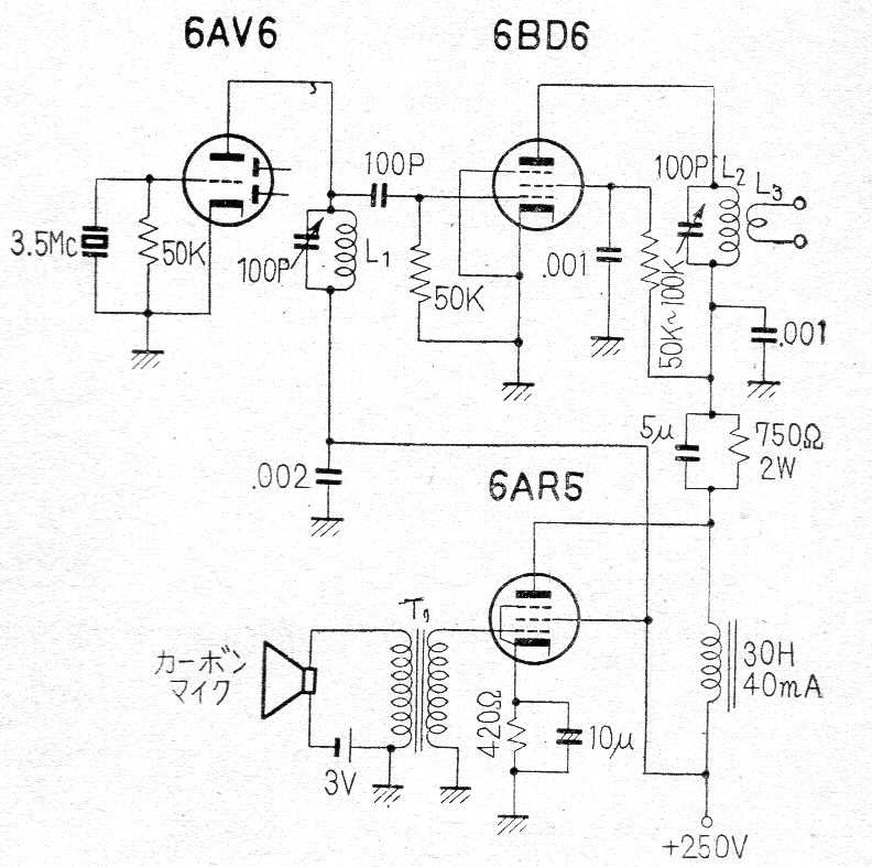 Este transmisor para el rango de los 80 metros o 3,5 MHz de radioaficionados fue encontrado en una publicación japonesa de 1962. El circuito utiliza válvulas que aún se pueden encontrar y la fuente de alimentación no es dada. Las bobinas tampoco son detalladas, pero se pueden obtener sus características en proyectos similares del sitio.