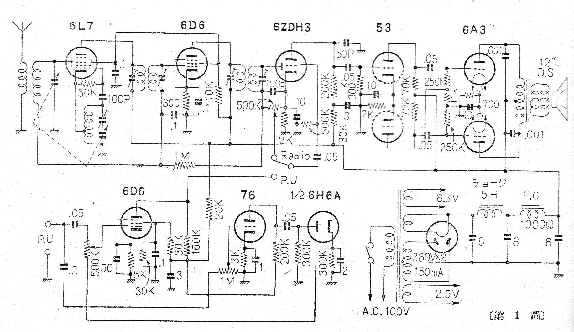Encontramos este circuito en una publicación japonesa de los años 60. Sirve sólo de referencia pues las bobinas y transformadores ya no se pueden encontrar actualmente. Los detalles de la bobina de antena no se dan.