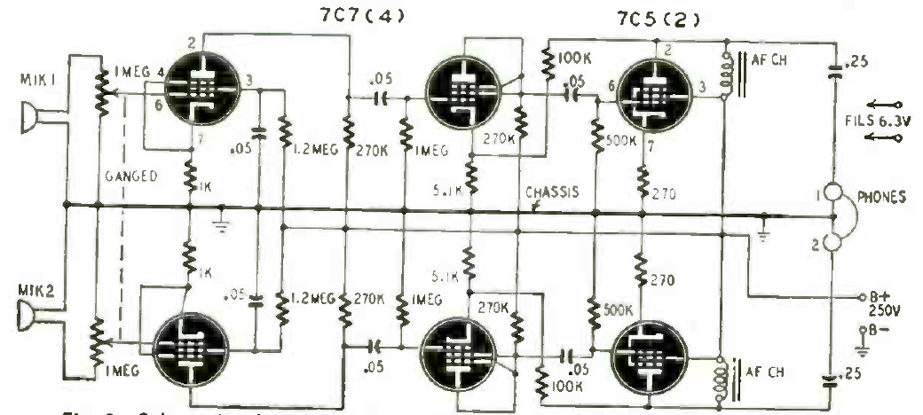 Este interesante amplificador para ayuda auditiva con dos micrófonos es de una revista Radio Craft de 1949. El circuito tiene dos tensiones de alimentación, para el filamento y placas y el auricular debe ser estéreo de alta impedancia. Los micrófonos deben ser piezoeléctricos y el circuito no utiliza transformadores (a no ser en la fuente).