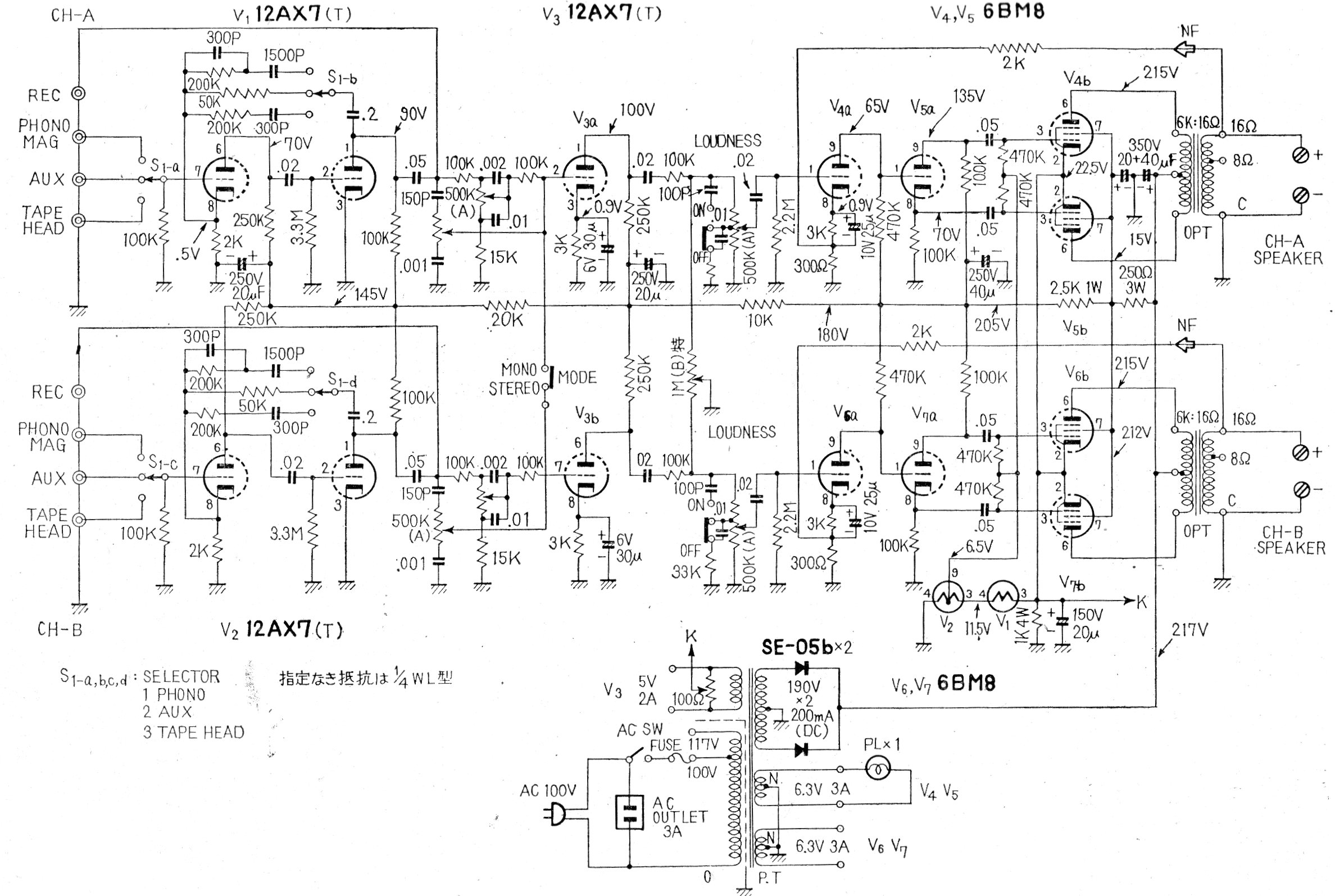 Este amplificador valvular estéreo de algunos watts de potencia utiliza válvulas 6BM8 y se encuentra en una documentación japonesa. Los detalles de la construcción se dan, pero poca información sobre las características a no ser las curvas de ecualización para las diversas entradas.