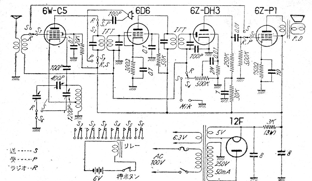 Este receptor de 5 válvulas fue encontrado en una publicación japonesa de 1950. El circuito tiene una configuración común para la época y las válvulas usadas eran de tipos que hoy ya no se encuentran. El circuito era del tipo super-heterodino.