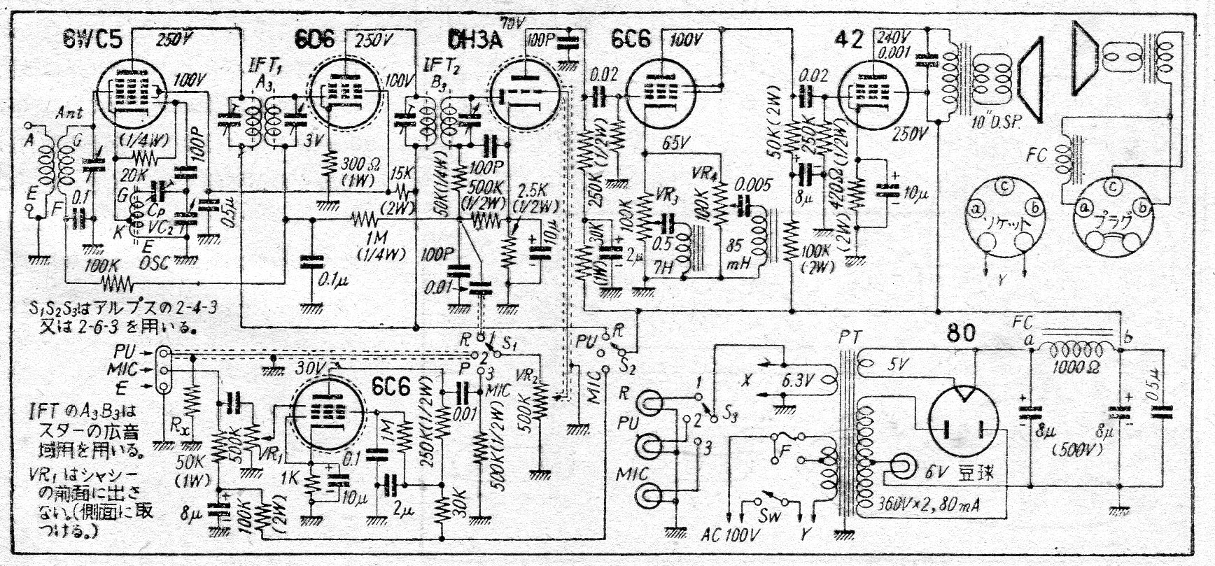 Este circuito de receptor valvulado fue encontrado en una documentación de 1950. El circuito es del tipo super-heterodino y tiene entrada de fonocaptor para tocadiscos. Las válvulas son de tipos de época.