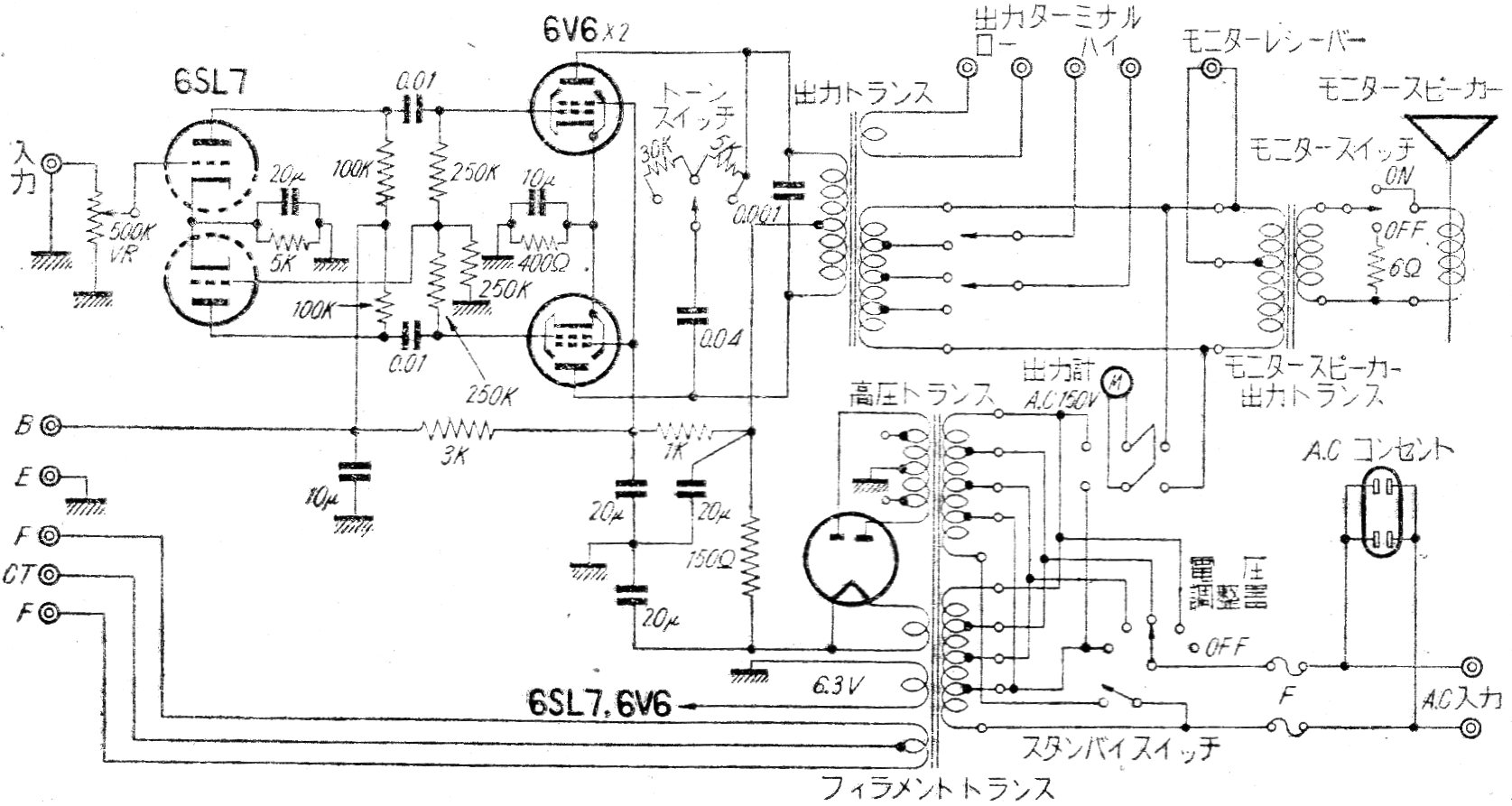Esta configuración de amplificador con las válvulas 6V6 en push-pull clase B es de una publicación de 1950. Se trata de la revista The Radio Experimenter Magazine en una traducción al japonés. El circuito utiliza 5 válvulas y tiene varias características como salidas para sonido ambiente.