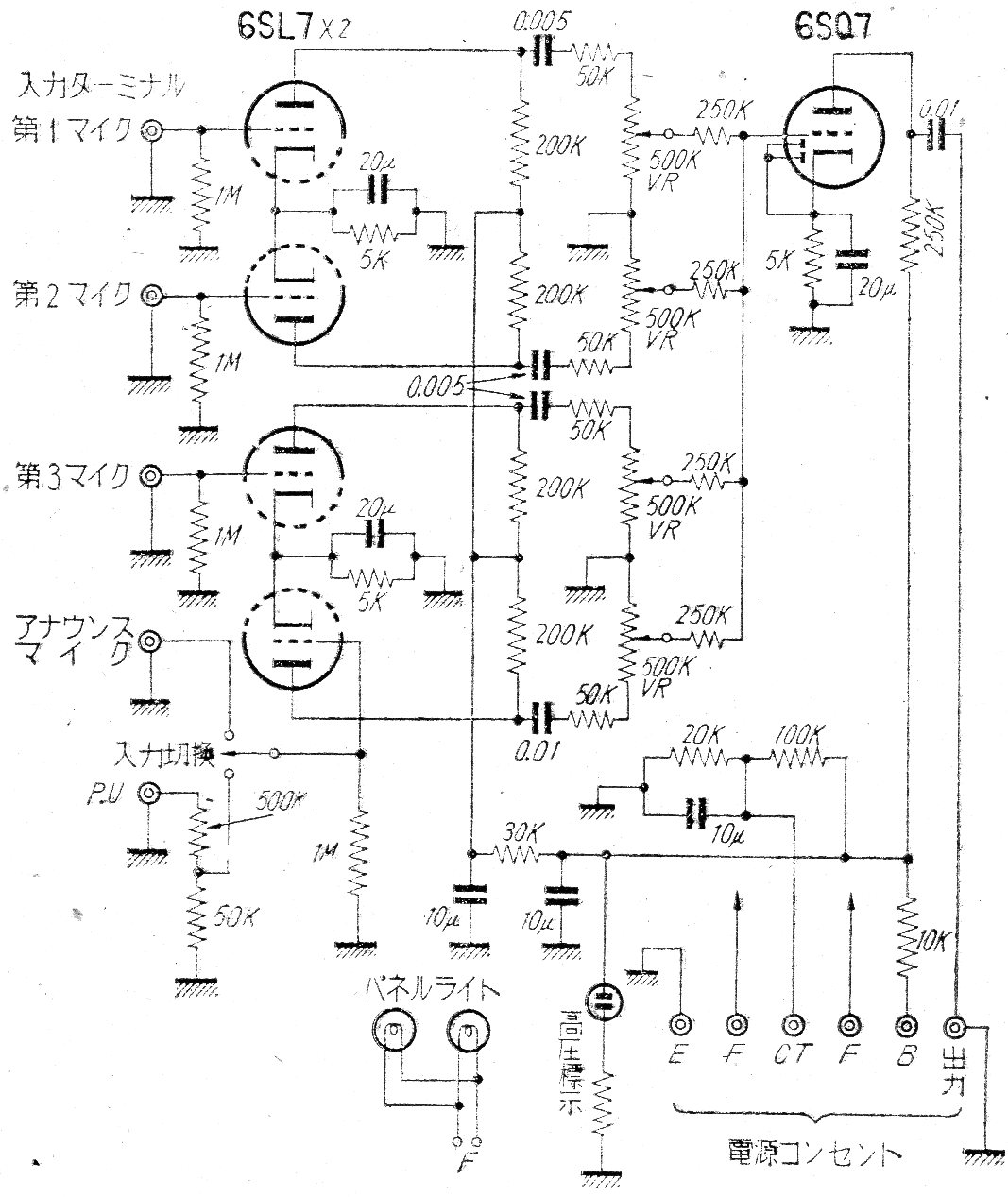 Este circuito fue encontrado en una documentación japonesa de los años 50. Se trata de un preamplificador con diversas entradas usando válvulas de la época. El circuito no incluye la fuente de alimentación.