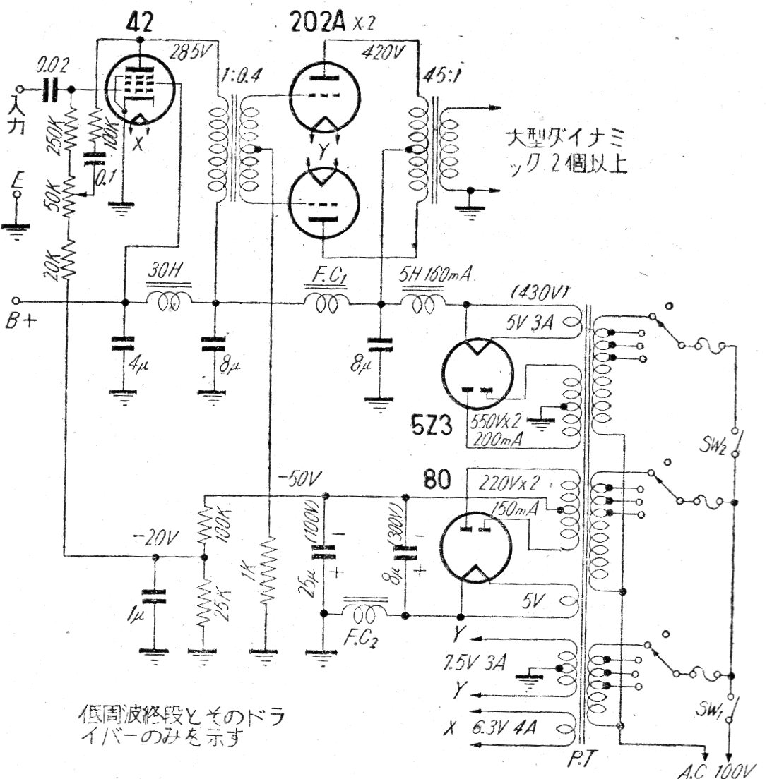 Este amplificador de audio de buena potencia fue encontrado en una publicación de los años 50. El circuito tiene una doble fuente con dos válvulas rectificadoras de la época. No se ha indicado la potencia en la publicación japonesa original.