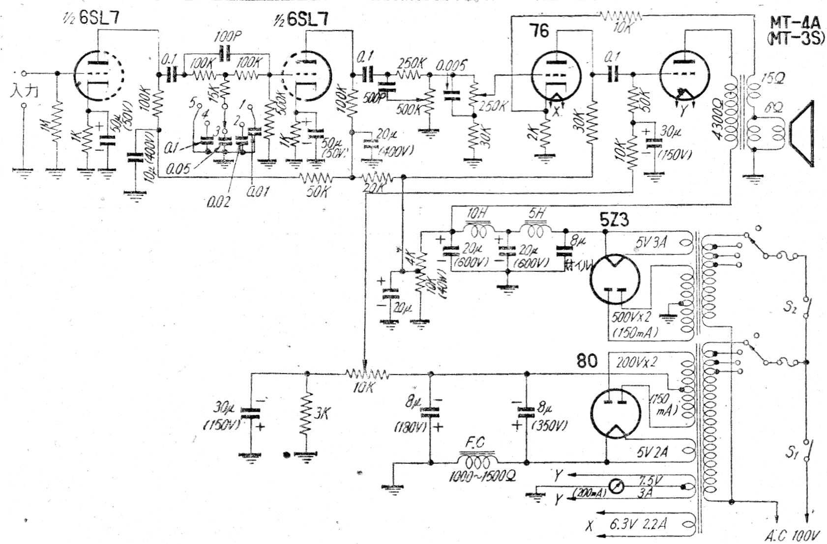Este amplificador de 25 watts fue encontrado en una publicación japonesa de los años 50. El circuito tiene dos válvulas en la fuente rectificadora y 4 válvulas en el circuito de amplificación. El circuito trabaja con tensiones bastante elevadas para conseguir la potencia indicada. Observe la tensión de la red del Japón de la época: 100 V.