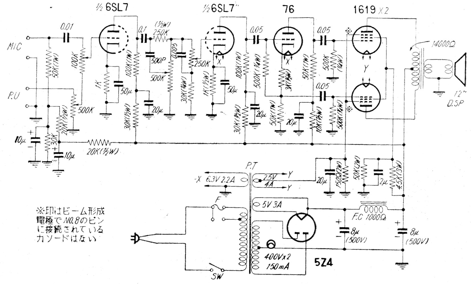 Encontramos este amplificador valvular con salida push-pull clase B en una publicación japonesa, en realidad traducción de la revista americana The Radio Experimenter's Magazine de los años 50. El circuito utiliza componentes de la época en una configuración tradicional. Observe la fuente con dos tensiones de entrada.