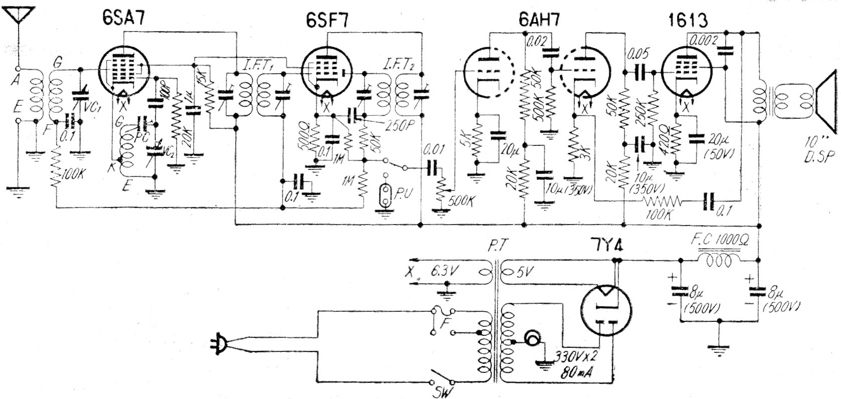 Este amplificador de 25 W con una válvula de salida sólo se encontró en una revista japonesa de los años 50. El circuito tiene 5 válvulas, siendo una doble y tiene una etapa receptora de una banda de onda. El circuito incluye una entrada para tocadiscos (pick-up) indicada por P.U.