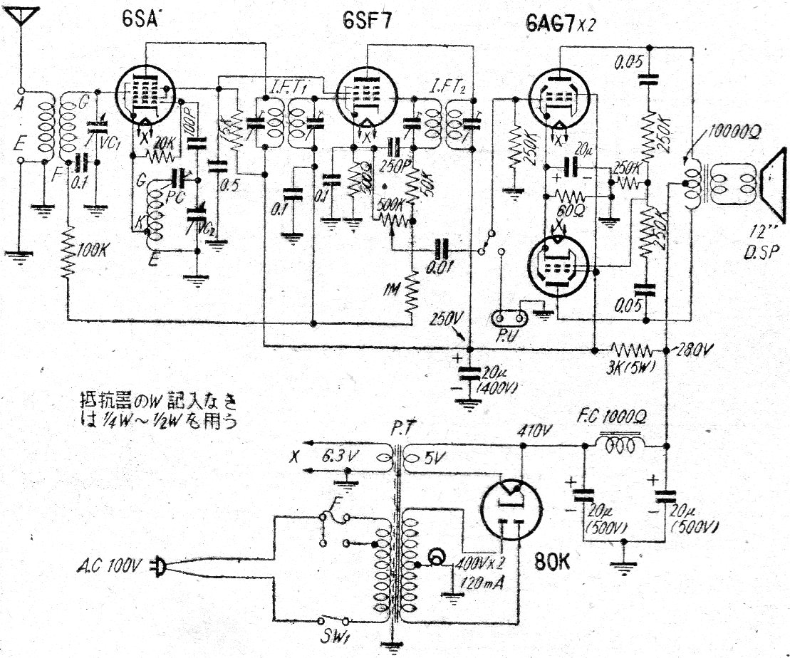 Este circuito es de una traducción japonesa de la revista The Radio Experimenter's Magazine de los años 50. El circuito super-heterodino utiliza 5 válvulas de la época y te una buena potencia de salida. La potencia de salida de este circuito es de 8 W e incluye una entrada para tocadiscos (PU).