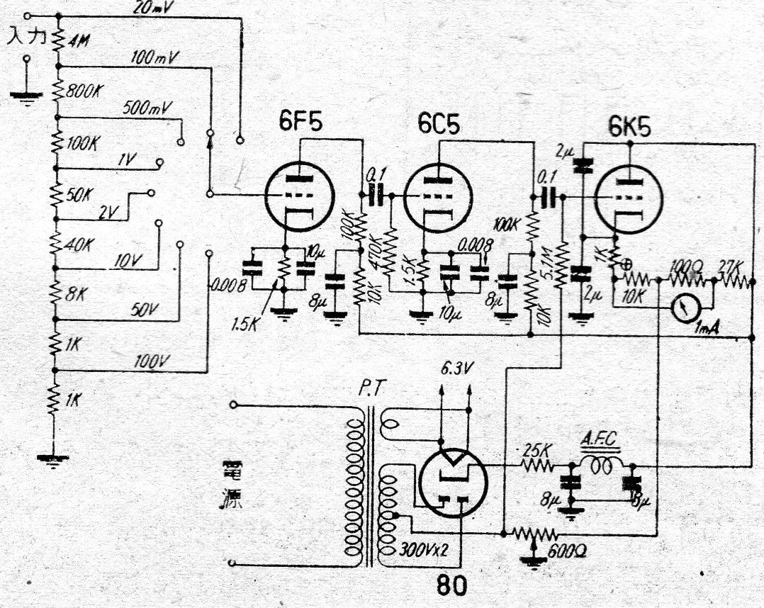 Este es un instrumento tradicional de los talleres de los años 50 e incluso después. Se trata de un voltímetro de alta impedancia usando válvulas amplificadoras para excitar un instrumento indicador analógico. Este es un circuito comercial de la época con diversas escalas de tensiones continuas y elevada resistencia de entrada.
