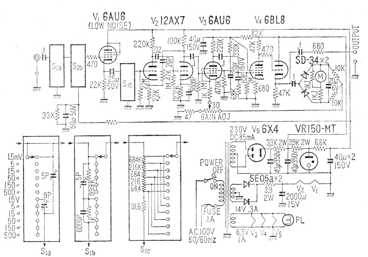 El circuito presentado es de un voltímetro comercial japonés de los años 60, encontrado en una documentación técnica de 1968. El circuito de alta resistencia de entrada utilizaba varias válvulas y era alimentado directamente por la red de energía.
