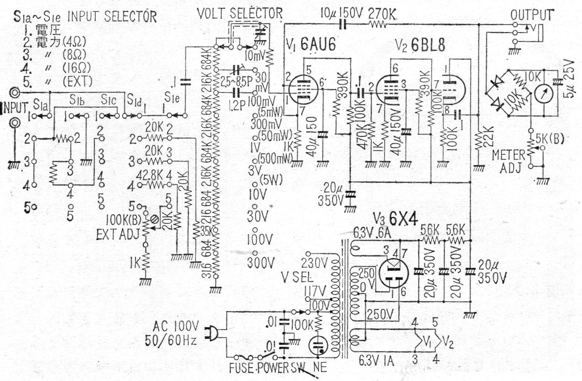 Este es el circuito de un voltímetro electrónico comercial modelo VT103 vendido en Japón en los años 60. El circuito utilizaba varias válvulas y tenía varias escalas de tensión con una resistencia de entrada muy alta. La fuente de alimentación estaba incluida.