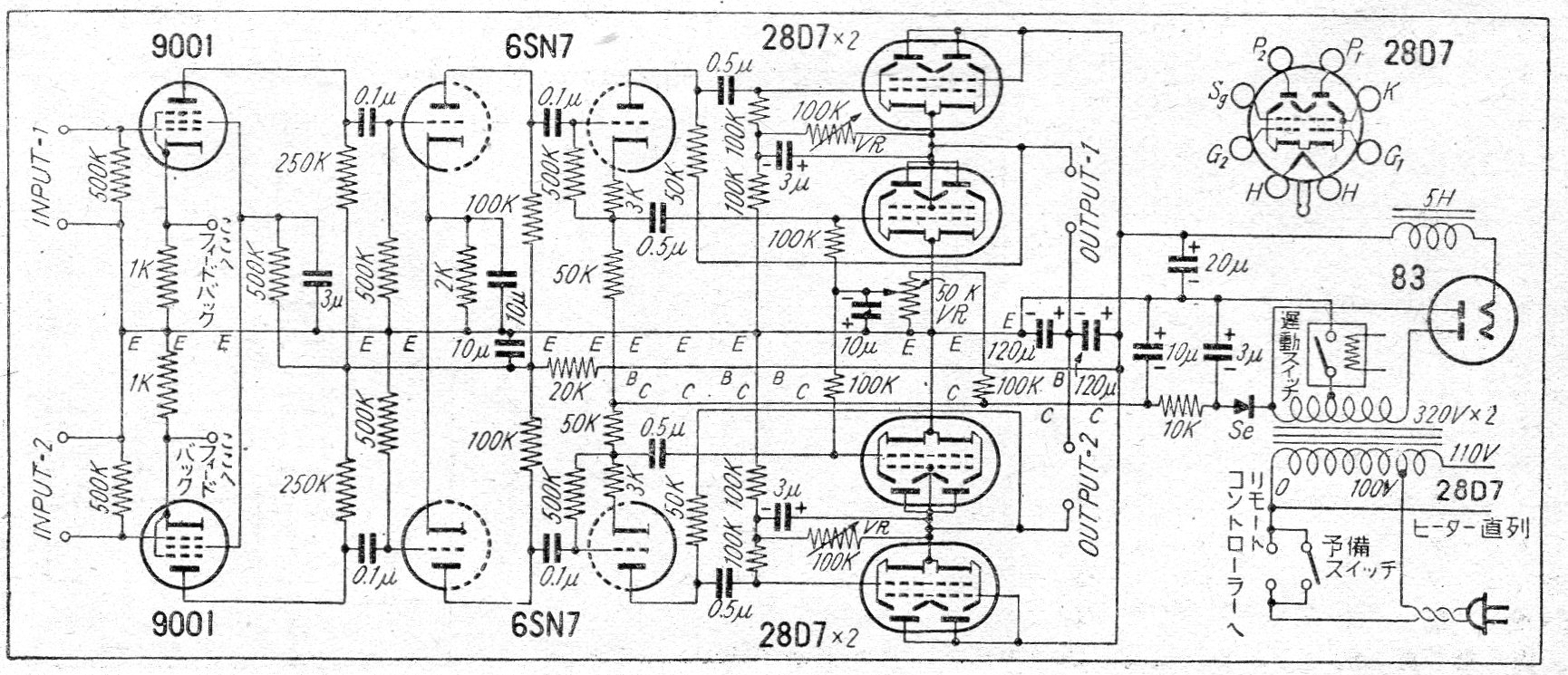 Este antiguo amplificador valvular (2807) de algunos watts fue encontrado en una revista japonesa de los años 50. Todos los componentes principales como válvulas y transformadores son raros hoy. El circuito es estéreo proporcionando los dos canales.