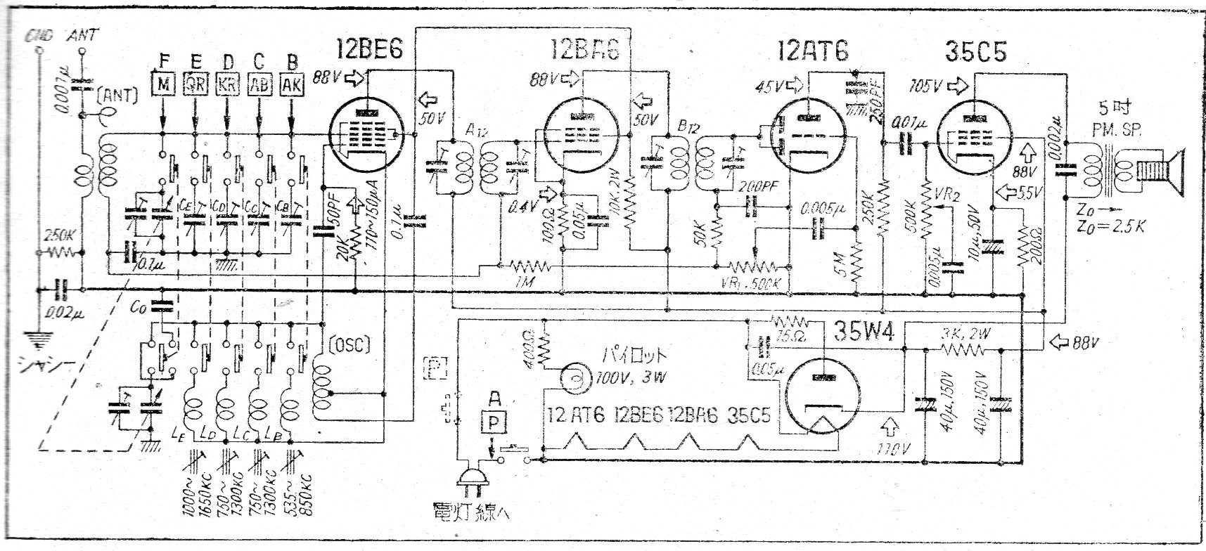Esta radio de varias bandas sin transformador (cola caliente) es de los años 60 habiendo sido encontrada en una documentación de la época. El circuito utiliza el sistema de alimentación de los filamentos en serie resultando en 100 V que es la tensión de la red de Japón en la época.