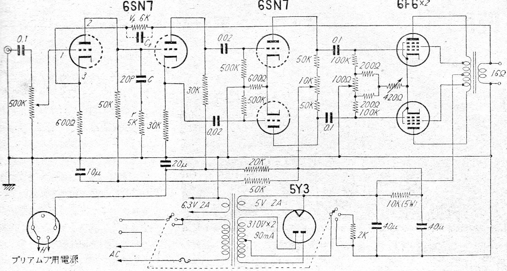 Este potente amplificador de audio fue encontrado en una publicación japonesa de los años 50. El circuito incluye la fuente de alimentación y tiene salida en push-pull clase B, utilizando un transformador apropiado. El circuito incluye la fuente de alimentación con la válvula rectificadora 5Y3.