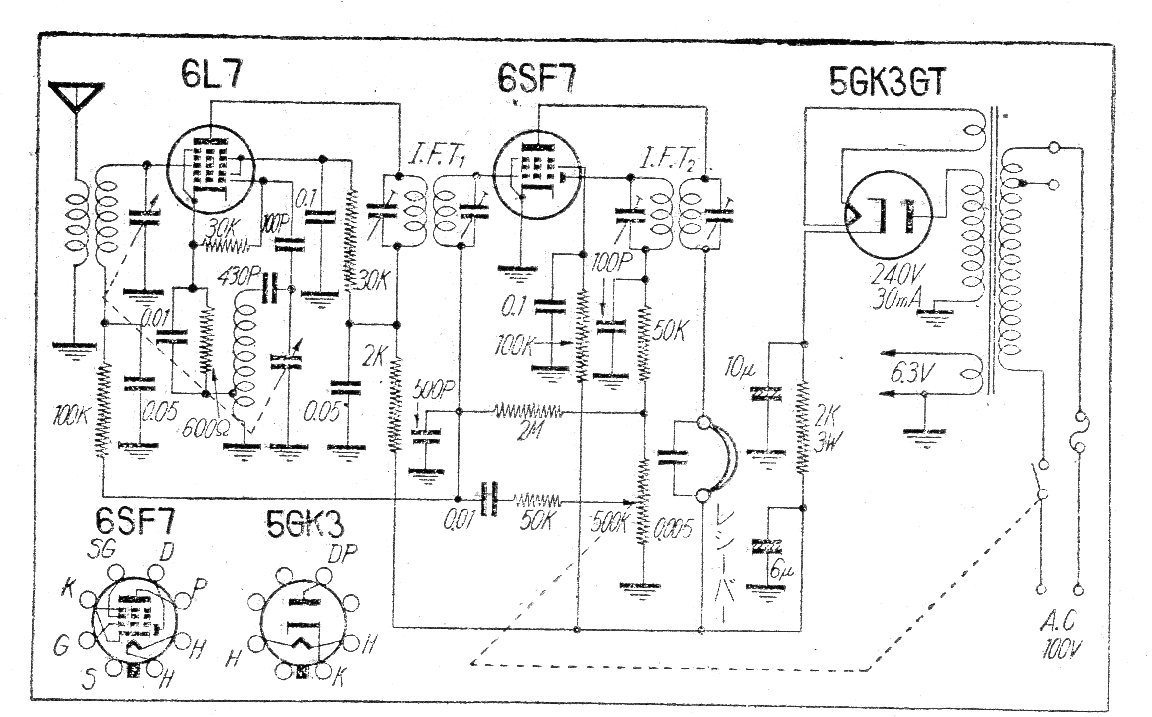 Este receptor de los años 50 era indicado para escucha de la banda de ondas medias en auricular de alta impedancia. El circuito de 3 válvulas tenía una excelente sensibilidad e incluía la fuente de alimentación con una de las válvulas. El pináculo de las válvulas se indica en el diagrama.