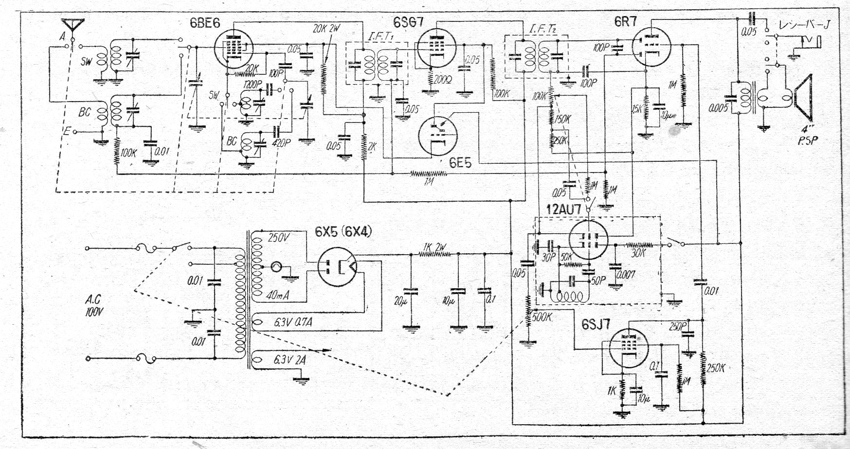 Encontramos este circuito de receptor super-heterodino para la banda de ondas medias y cortas en una revista japonesa de los años 50. El circuito de 6 válvulas incluía fuente de alimentación con transformador y salida para auriculares.