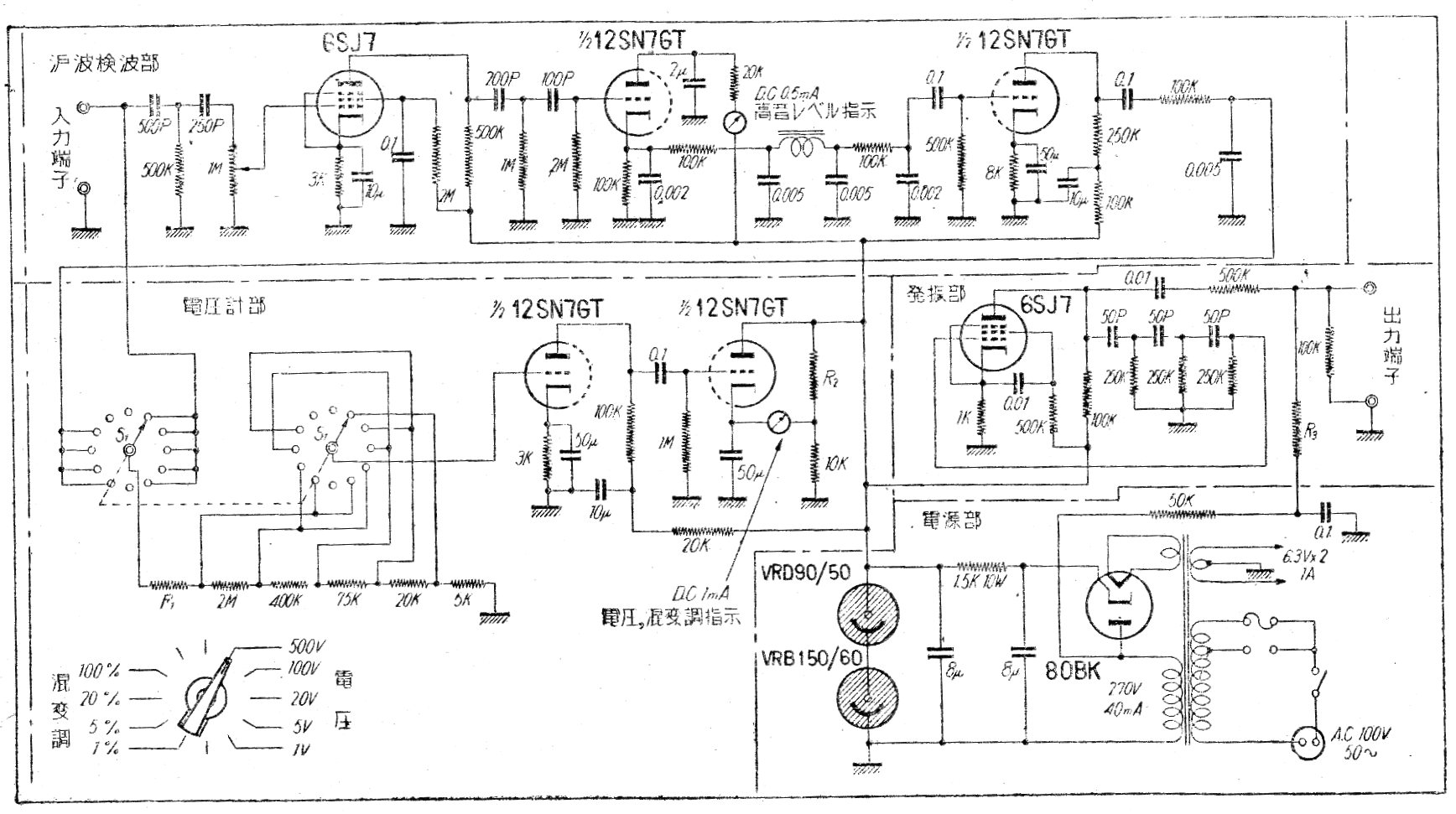 Este circuito encontrado en una revista japonesa de los años 50, adapta un multímetro analógico común para permitir que funcione como un sensible voltímetro electrónico de diversas escalas con una resistencia de entrada muy alta. El circuito incluye la fuente de alimentación, pero requiere el empleo de componentes de precisión.