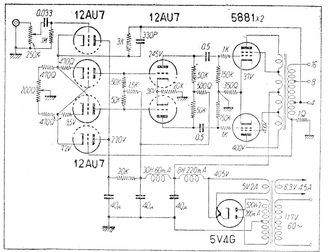 Este amplificador con la válvula 5881 fue encontrado en una revista técnica japonesa de los años 50. El circuito tiene una etapa de entrada con una configuración inusual para la inversión de fase de las señales y la excitación de las etapas de salida.