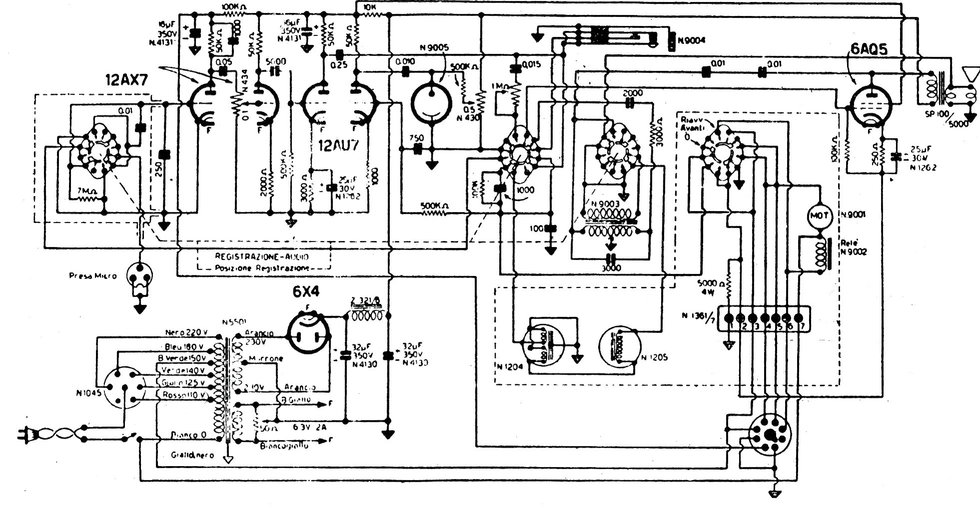 Este es el circuito del grabador comercial de rodillo o cinta antigua, de la década de 1970, geloso modelo G-242-M. El diagrama puede ayudar como referencia en la recuperación de un equipo de este tipo. Observe la presencia de una válvula reguladora de tensión que puede ser sustituida por un zener de alta tensión en una eventual recuperación del aparato.