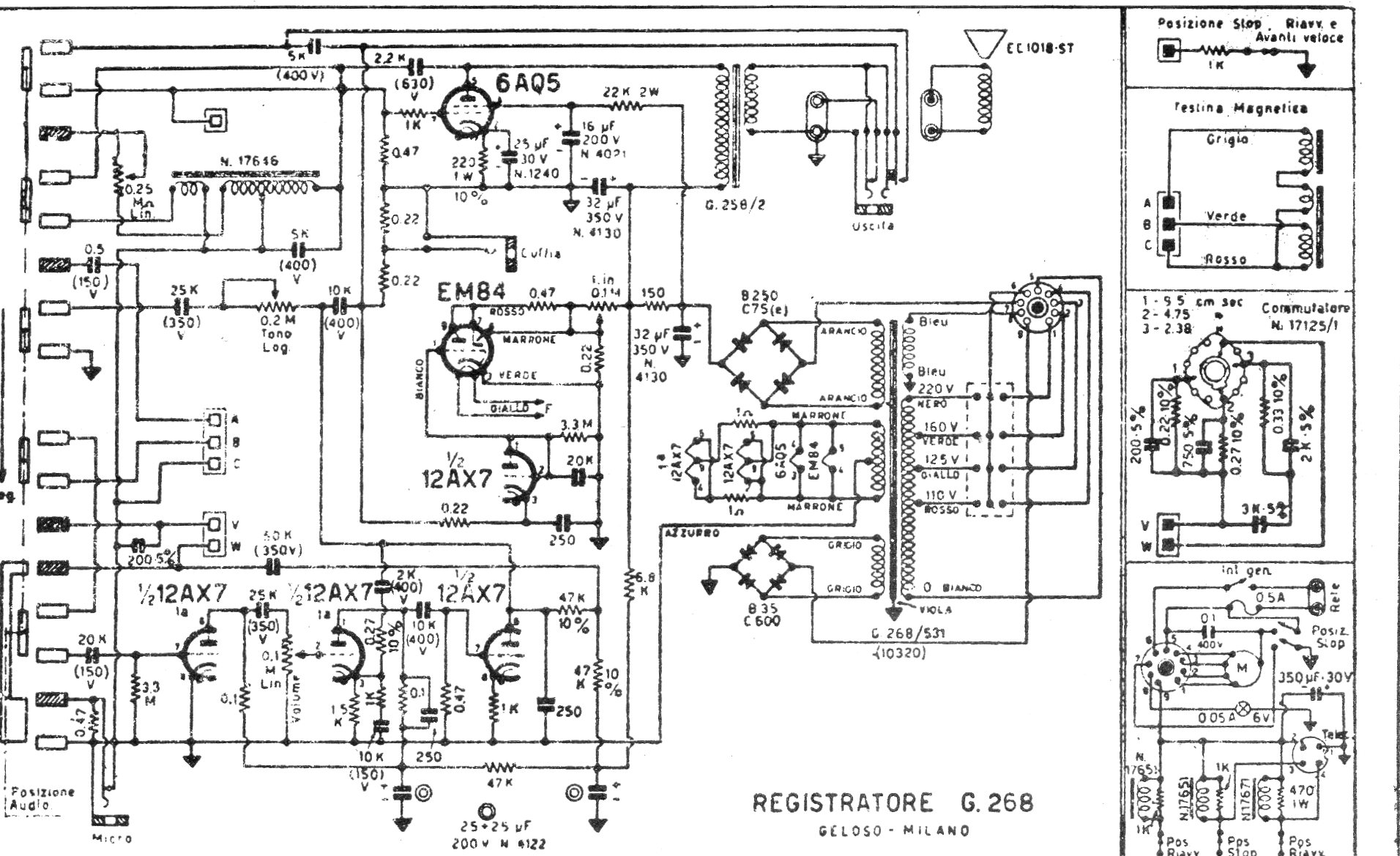 Este es el diagrama de un grabador de rollo o cinta de la década de 1970. Se trata de un grabador italiano de la línea Geloso, bastante popular en la época. El circuito vale como referencia para la recuperación de un equipo.
